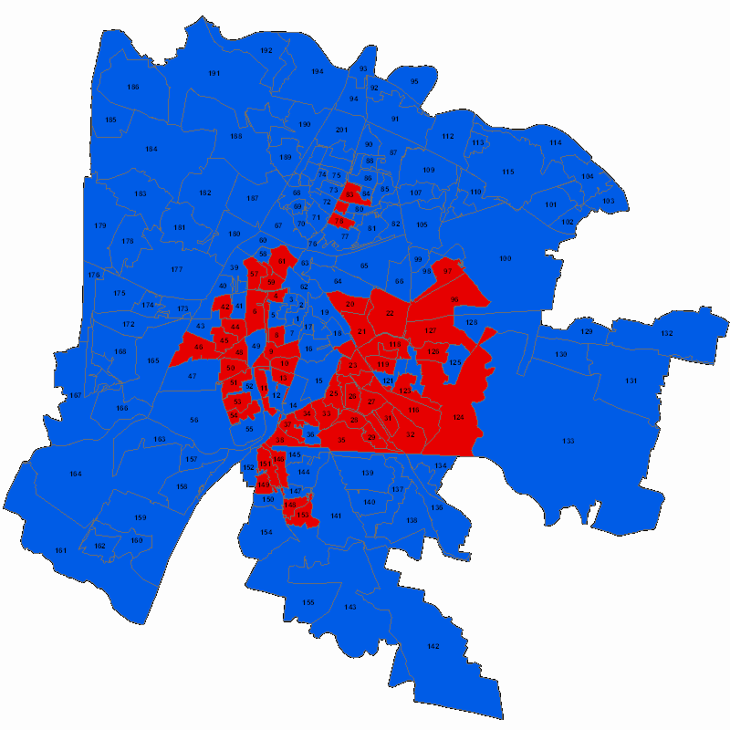 La mappa evidenzia per ciascuna sezione la lista con il maggior numero di voti al momento.