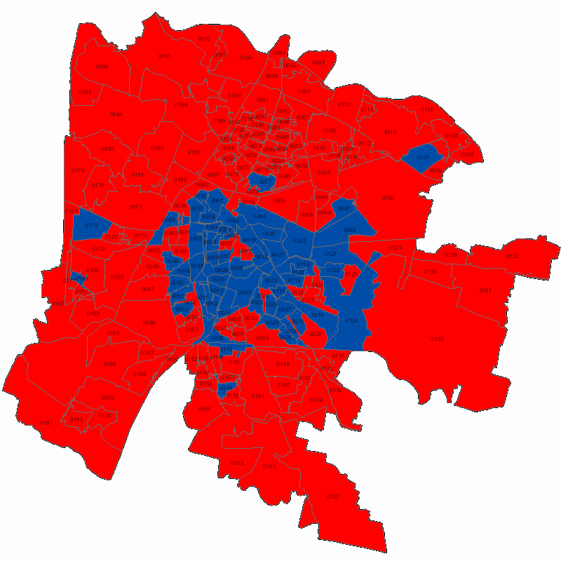 La mappa evidenzia per ciascuna sezione la lista con il maggior numero di voti al momento.